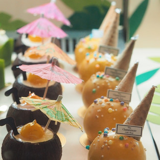 受夏威夷热烈奔放的夏日风情启发,郭主厨为我们带来的是外型和口味极其清凉解暑的小甜点。如图所见,有冰淇淋筒、夏威夷白色木槿花、火烈鸟、皮娜可拉达鸡尾酒(Pina Colada)和绿花园的造型,样式惟妙惟肖十分精致。
