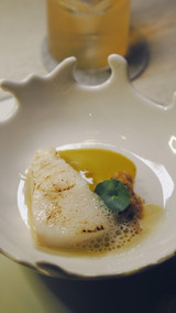 第二道前菜是热菜,烤箱烧烤的鳕鱼,配上森美兰州的特色椰浆咖喱(masak lemak cili api)乳化的酱汁,奶醇鲜香,加入吉兰丹番薯(ubi kemili)将酱汁的稠度增加,变得更厚稠绒滑。椰浆咖喱配白鱼则让鱼肉充分吸收了酱汁美好的滋味,椰浆的奶醇加香茅辣椒等东南亚香料在地的香草香气。烤鱼边旁也打了一股扇贝泡沫(scallop foam),用了上道菜的北海道扇贝边角调制而成,实行零浪费料理。