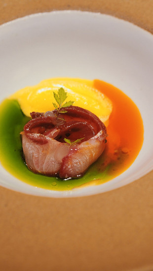 第二道实验性的前菜是一客柠汁腌鱼生(ceviche),有着明亮的红绿灯色彩配搭。鰤鱼(hamachi)用甜菜根腌渍,带出根茎蔬菜的泥地气息。橙红液体是甲壳海鲜萃取的油(seafood oil)、绿色是芫荽油(coriander oil);明黄色则是这道柠汁腌鰤鱼的酸甜味元素担当——黄梨雪葩(pineapple sorbet)。海鲜油衬托鰤鱼的海鲜风味;而芫荽油切除鱼肉本身的脂肪,酸甜的黄梨雪葩则带来非常显著的热带果酸风味,直接将鱼生的质感立体化。基于这一道菜还未上至这一期的The Culinary Journey菜单,因此笔者期待下一张菜单它最终极的表达。