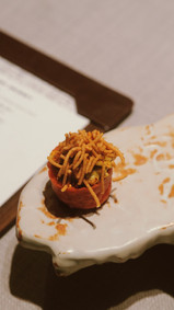 第二道小吃是一枚黑胡椒蟹(pepper crab),受回水地带的喀拉拉邦(Kerala)的特色泥淡水蟹(mud crab)所启发。泥蟹肉拉丝用黑胡椒和其他暖辛香料腌制过后,放在一枚小吐司上,细香葱装饰收尾。黑胡椒蟹肉啖啖肉的温热鲜香搭配半绵脆的吐司有着极富风味冲击和层次交叠的口感。
