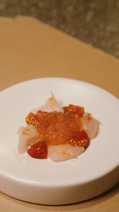 然后是一个鲭鱼寿司卷(saba sushi),笔者最喜欢的一道寿司口味。醋饭用中国黑醋和绍兴酒腌制。传神之笔在于融桂花水入舍利饭,配上熏香的微烤鲭鱼时吃出一个口口生花香的滋味、搭配鲭鱼上的荔枝果脯(lychee compote)的香甜和应出高度相称的甜香。鲭鱼咸鲜熏香、醋饭有黑醋独特的酸甜再叠加桂花荔枝的的芳香甜香,最后一口莳萝完成出草香料的植物生鲜…就如同Haruka先生所言—“是一口的平衡”(a perfect balance)。