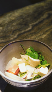 第二道才便还是着轻而开始。仍旧是冷菜,夹乌达乌达(otak-otak)的日式三文治(sando)。忘了提起刘主厨是吉隆坡人,但在槟城LUT的姐妹餐厅工作生活多年。因此不难看出这道菜单从一开始,便处处受槟城元素的影响。