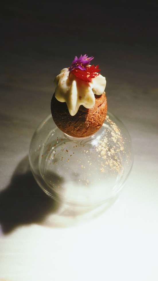 紫罗兰雪宝外形带着冬雪缤纷的气息,架构上主要是将地瓜球当作原型而展开主厨自己的演绎。地瓜球本是空心,洪主厨转而想将其填馅。如华人喜饼一样,地瓜球内填的是捣碎过的芋泥。这么一来,又像芝麻枣,但以地瓜球做外壳。地瓜球配同属根茎蔬菜的芋头,芬芳幽雅
