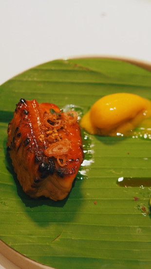 再后是Chef Don John演绎的蕉叶烧蒲鱼。蒲鱼涂上罗望子烧烤釉汁,撒上一些花生碎和炸葱头增加香气和口感。边旁是同款的糖渍花生酱,授自主厨母亲的青柠娘惹杂菜(lime acar),便配一剂青柠汁。最后佐一笔酸凉的青芒果雪葩,完整地平衡这道菜强烈的咸甜焦香。主厨建议将盘上每一个元素逐一食用;再将鱼肉、雪葩和花生酱一同送入口中,以达理想口感。