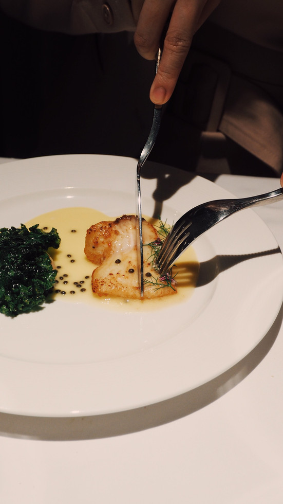 菜单的压轴,为来自大西洋、于法国菜的餐桌上常见的多宝鱼(turbot)作为主菜。很经典的香煎多宝鱼配白酒奶油酱(Turbot aux Beurre Blanc),大量牛油烹调出的奶油酱丰腴奶醇,以酸度高的白葡萄酒降低牛油的渍腻,海盐与伊朗鲟鱼子酱(baerii caviar)调味、莳萝增香。佐鱼的主盘小菜是一枚以虾肉、扇贝、多宝鱼边角酿制的海鲜慕斯,用英国芥兰(British kale)包覆表层,啖啖海鲜肉还有口感丝绵不失微脆的香烤芥兰。多宝鱼轻轻用刀锋掠过便碎成半,入口便如冰花一般绵融在舌中。白酒奶油酱和莳萝的配对则不断散发出传统法式的居家风味,这道主菜可谓十分安胃。