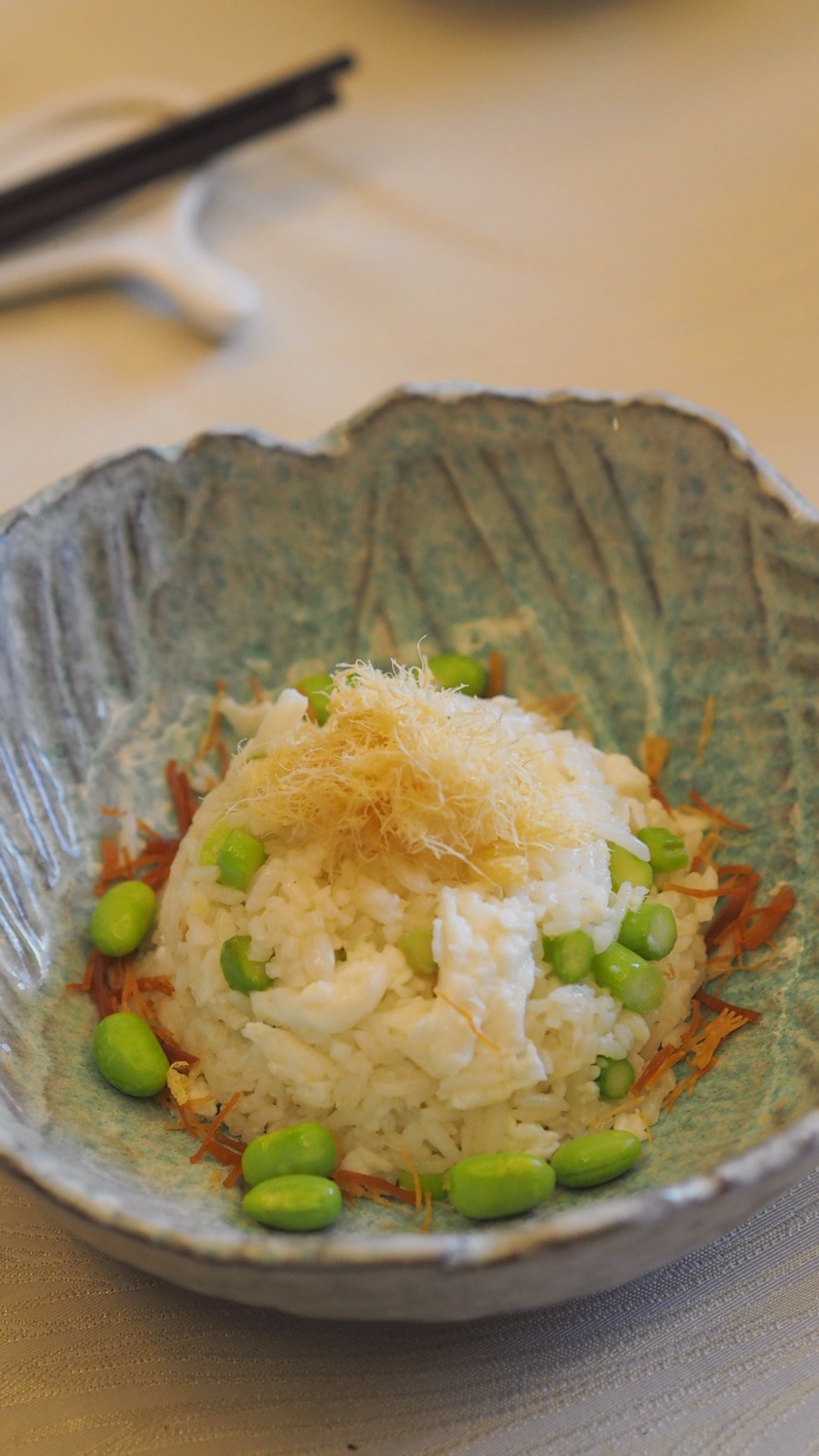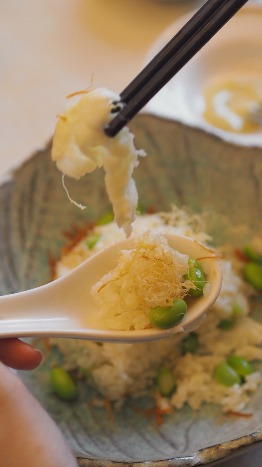 同普通的粤式蛋炒饭稍稍不同。为了强调江瑶柱(干贝)的海味风味,桃花套餐系列的炒饭只用蛋白下锅爆炒。少了蛋黄的脂腴,无需担心胆固醇聚积;同时用味道比较清淡、富蛋白质的蔬菜类日本毛豆入馔,不论架构和口感亦更轻爽、少油腻。