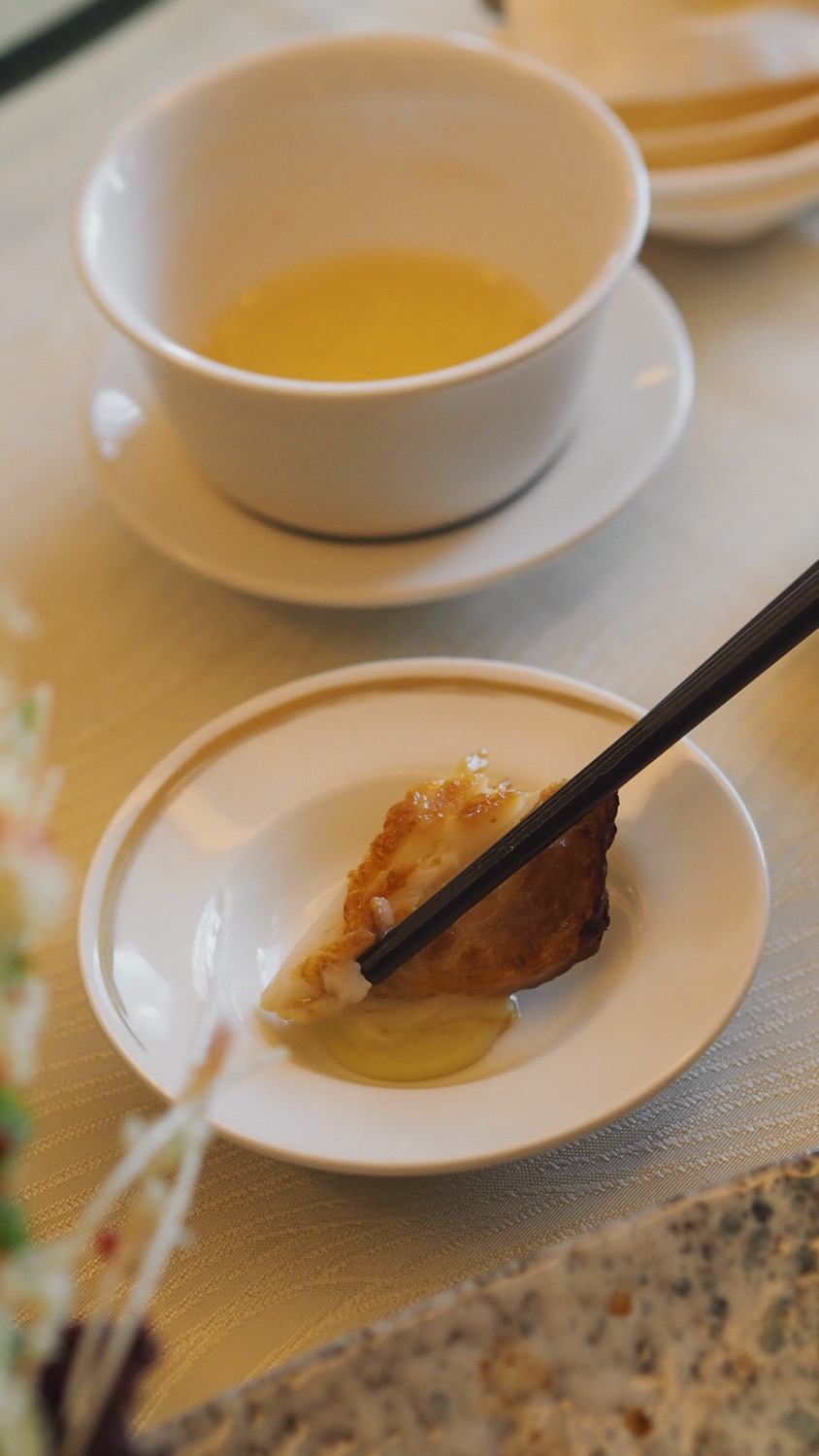 卷饼里的馅料也同豪华升级版的传统北京鸭相似。鸭脯肉硕大多汁、肥油层与鸭胸肉分布均匀;切丝的葱花干爽清脆,青涩的鲜草味平衡烤鸭的油脂。林主厨也为烤鸭卷饼画龙点睛,加入了油炸腐竹皮夹入蛋饼皮,为卷饼添一口咸脆,多了一层更丰富的口感。用日式鱼卵点缀,明亮的橙色为整道菜更添声色。